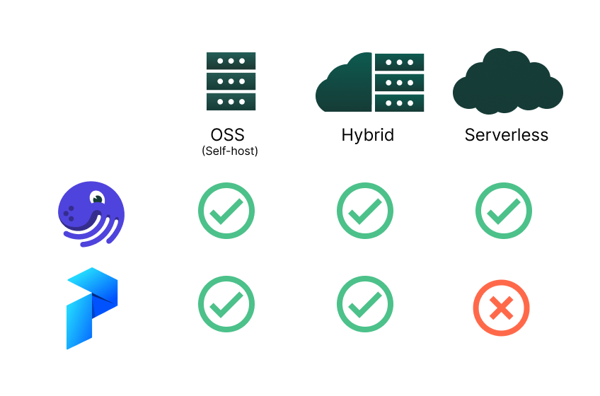 Dagster and Prefect offer self-hosted open-source stack options. Both also offer a hybrid deployment model. Additionally, Dagster offers a fully serverless environment for data teams who want to eliminate infrastructure management and get projects up and running quickly.